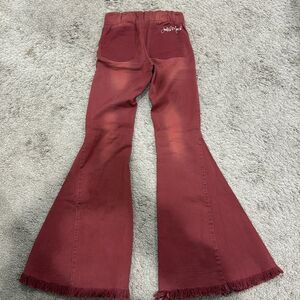 Stylish rust red belle bottom pants with lace-up detail. Perfect for a bold look. Size medium. Judith March. Fridge detail on the bottoms. Extra wide belle bottoms
