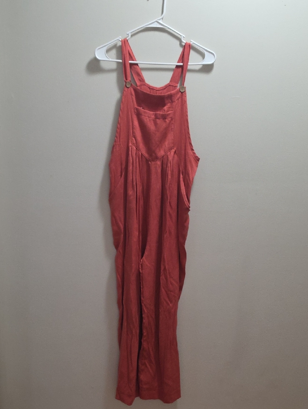 Loose-fit linen overalls in a warm rust-red. Adjustable shoulder straps with front bib pocket. Relaxed wide-leg silhouette. Easy, casual staple for layering.