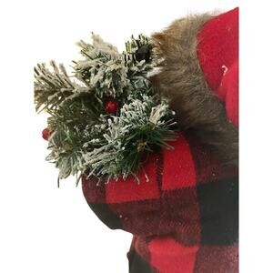 Santa wears a red and black buffalo plaid coat with faux fur trim, snow boots, and gold-rimmed glasses. He holds a frosted evergreen bouquet with red berries and a pair of miniature snowshoes — perfect for cabin, lodge, or farmhouse-style Christmas décor.