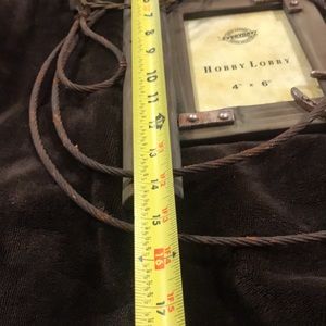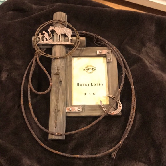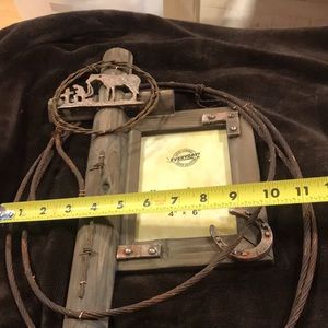 Rustic 4x6 frame with metal rope design, cowboy at the cross, barb wire and horseshoe.