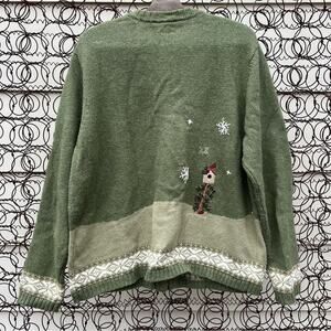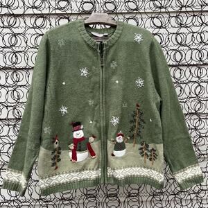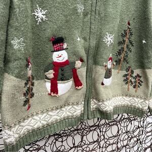 Croft & Barrow rustic Americana snowman birdhouse pine tree ugly Christmas holiday winter cardigan sweater