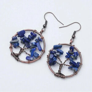 Rustic Antique Copper Lapis Lazuli Tree of Life Gemstone Beads Dangle Earrings