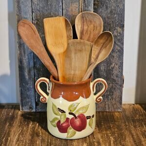 Vintage Ceramic Utensil Jar with Handles Rustic Apple Design Stoneware Crock. Russ Berrie and Co. Beautiful condition. No chips or cracks - does have crazing due to vintage age. Textured; Hand painted. Add a touch of vintage charm to your kitchen with this lovely Vintage Ceramic Utensil Jar Stoneware Crock. Featuring a delightful Rustic Apple Design, this jar is not only functional but also adds a pop of color to your space. The convenient handles make it easy to transport and display on your countertop. Perfect for storing your favorite cooking utensils or displaying fresh flowers, this crock is sure to become a beloved piece in your home decor collection.
