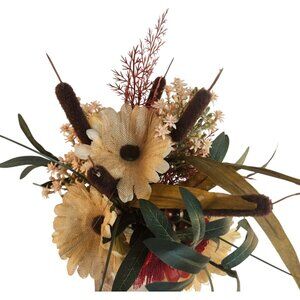 This handcrafted artificial floral arrangement features rustic burlap Gerbera daisies with a mix of wildflowers, cattails, and greenery, creating a stunning autumn-inspired centerpiece. The lifelike textures of the flowers are complemented beautifully by vibrant red, yellow, and earthy brown tones, adding warmth and charm to any space. Designed for long-lasting beauty, this bouquet is perfect for enhancing home décor, events, or as a thoughtful gift. Please note: the glass jar vase shown in the images is not included.
