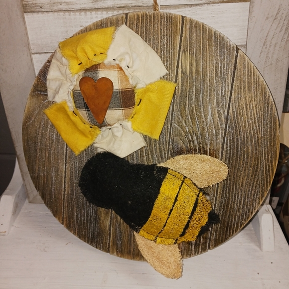 Charming rustic wall decor featuring a bee and flower design. Perfect for adding a cozy touch to any space.