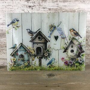Add a touch of country charm to your kitchen with this Rustic Birdhouse Glass Cutting Board. The design features four birdhouses surrounded by vibrant flowers and greenery, with a few birds perched playfully around. The background showcases a rustic barn wood look, creating a warm and inviting feel.