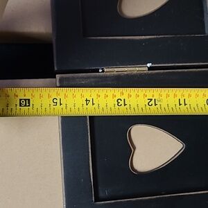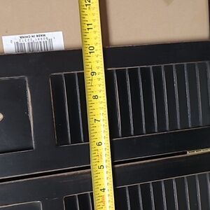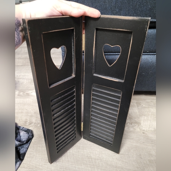 This charming decorative shutter piece features two hinged panels with heart cutouts at the top and louvered slats on the bottom. The distressed black finish gives it a farmhouse-inspired look, perfect for adding a cozy touch to any space. Great for tabletop decor or as a small accent on a shelf or mantle. Measures approximately 15" in height and 10" wide when open. In excellent pre-owned condition.