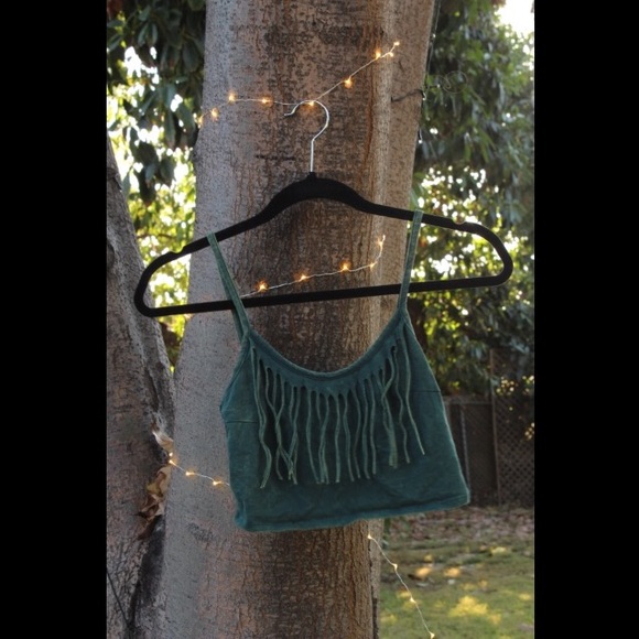 This too is super rad to pair up with something edgy or even a plain pair of jeans. Also looks sharp with a black leather jacket on top. Green in color, with lightly faded areas all around that are designed to give this piece an aged look. Fringe across the chest.