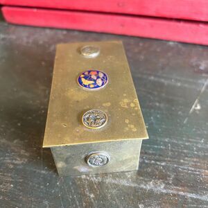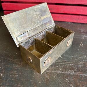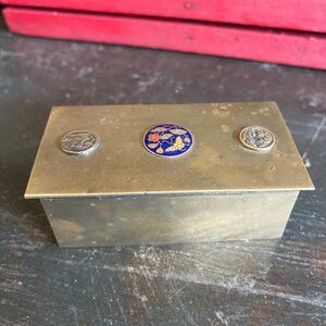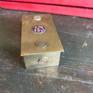 Organize your keepsakes in this unique, rustic brass box. The box has a timeless appeal with a charmingly worn finish. Its lid is adorned with a central, blue and gold enamel cloisonné inlay showing an intricate floral and bird motif, complemented by six vintage “coins”, 2 on top and four on the sides. Inside, the box is divided into three sections, making it a functional yet beautiful piece for storing stamps, jewelry, or other small items. The heavy, solid feel of the box, along with its rich patina, makes it a perfect decorative accent for a desk, bookshelf, or coffee table.