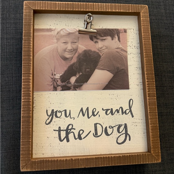 Display your cherished memories with this rustic brown photo frame, perfect for dog lovers. The frame features a charming 'You, Me, and the Dog' design, adding a personal touch to your home decor.