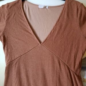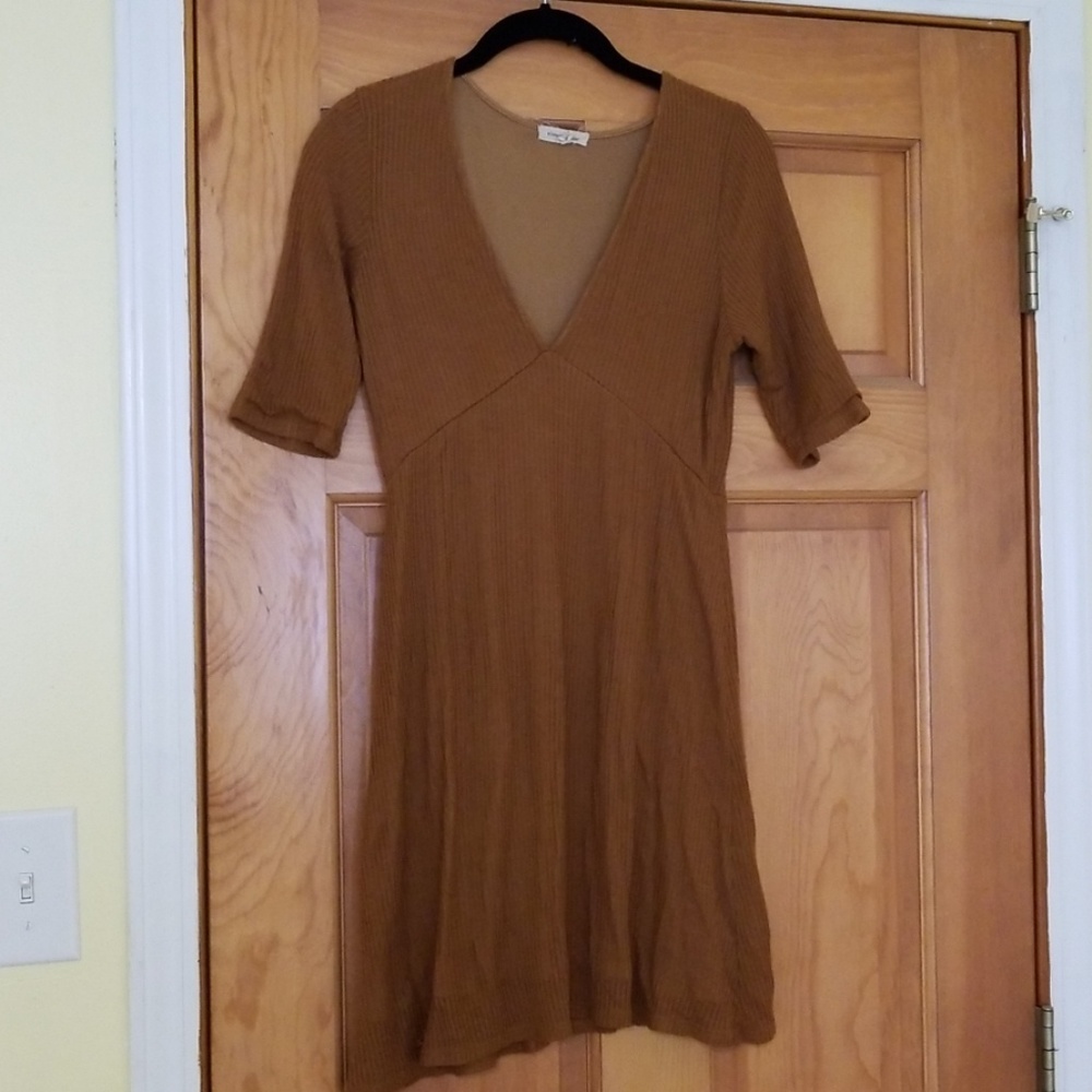 Brown, ribbed dress Low-cut v-neck Fabric worn in some places (see photos)