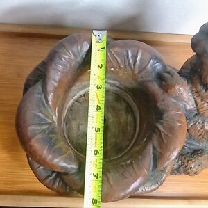 As shown in the pictures there is a chip off one of the rabbit ears. This plant holder is heavier weighing, 24 lbs. It was made in 1995 out of sandstone which is also shown in the pictures, on the bottom of the planter. This is very hard to find! It does need to be cleaned up as it has been outside in a garden.