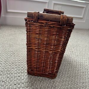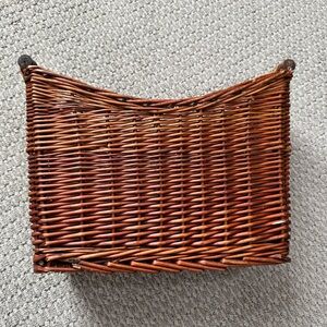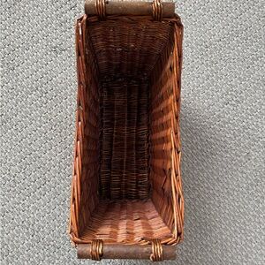 Enhance your home with this unusual brown wicker basket with wooden handles. Perfect for adding a touch of charm to any room. Fits magazines, books, knitting, sewing and so much more. Top of basket = 15.5” x 7.5”, 11.5” height, bottom of basket = 13” x 6”.