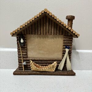 Rustic cabin picture frame with fishing pole, canoe, and oars. Cute for any farmhouse or cabin.