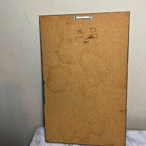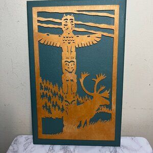Natural Wood Cut-Out of a moose in front of a totem pole mounted on slate blue painted particle board. Signed on back Richard Lassman. 18" x 11" x .5" Great rustic decor piece.