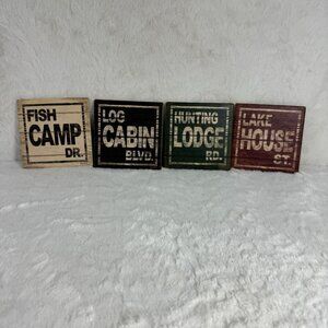 Transport yourself to a cozy cabin in the woods with this charming set of 4 coasters. Each piece is adorned with vintage-inspired street signs, reminiscent of peaceful retreats and outdoor adventures. The sturdy cork backing ensures your surfaces are protected, while the distressed faux wood finish adds a touch of rustic elegance to any setting.