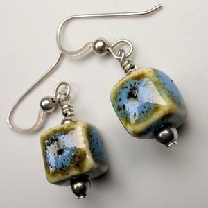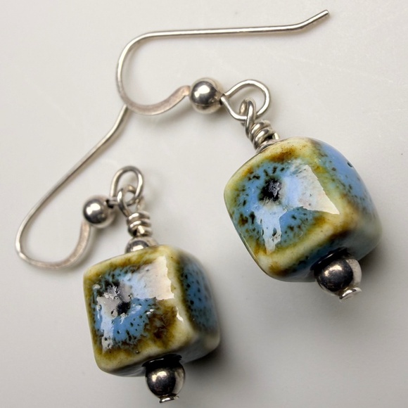 Own this rustic boho style ceramic earrings with blue, brown and cream designs on a silver tone wire hooks