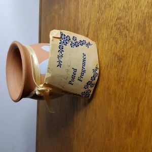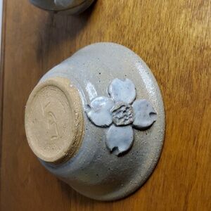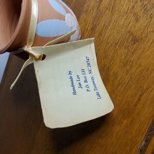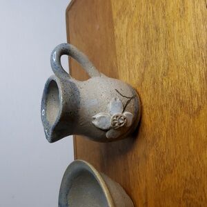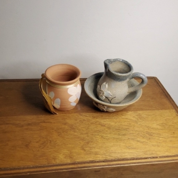 Enhance your home decor with this charming rustic ceramic vase and pitcher set. Featuring a natural brown vase with white floral accents and a gray pitcher with matching saucer, this set adds a touch of elegance to any space. Vintage mini pottery marked and original paper measures 2-3" in diameter condition beautiful.