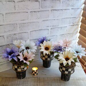 Vintage Checked Flower Pot Candle Set French Country Decor pairs with a variety of decor styles including farmhouse decor, shabby chic decor, French country decor, cottage core decor, and courtly checked decor. A great gift for a gardener, plant lover or check decor lover. These flower arrangements can also be paired with a checked vase, checked urn, checkerboard decor, black and white decor, black and gold decor, mckenzie childs collectible