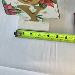 Charming set of Christmas decorations to add a touch of rustic holiday cheer to your home. This set includes a wooden slice featuring a delightful fox wearing a festive hat, surrounded by a wreath of pinecones, berries, and holly. The word "JOY" is spelled out on a Christmas tree with a poinsettia pattern. Perfect for adding a cozy, woodland-themed accent to your mantelpiece, bookshelf, or holiday table setting.