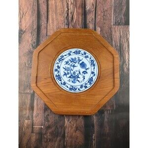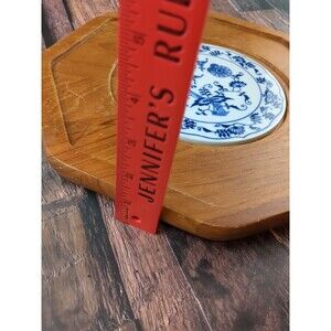 Vintage rustic teak wood tray with blue hexagon tile detail