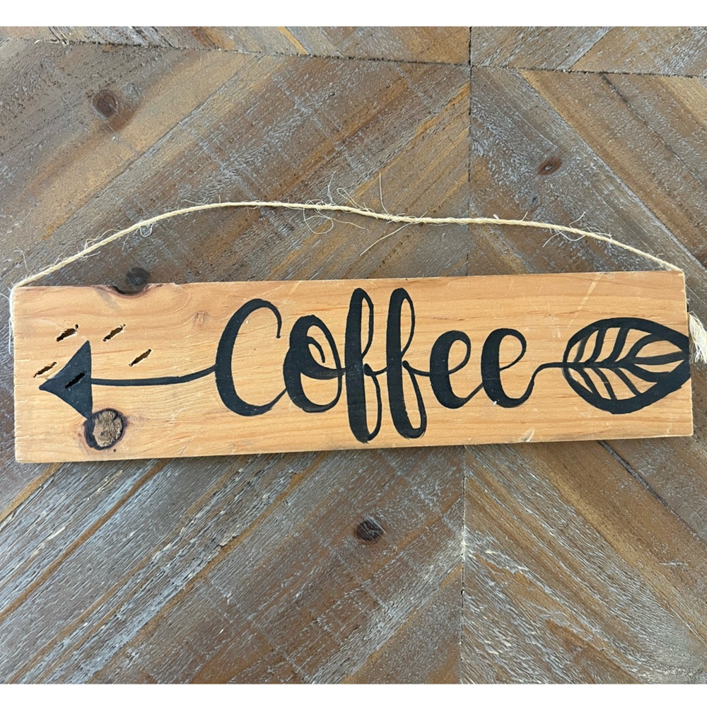 Rustic wooden coffee sign with arrow and leaf design, featuring a natural wood grain