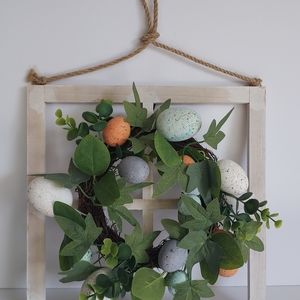 Rustic hanging wall wreath decor. Hand crafted multi colored framed wreath.