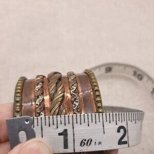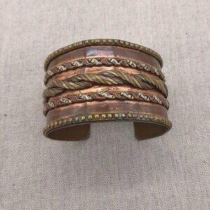 Rustic Copper Mixed Metal Rope Cuff Bracelet. Very cool mixed metal copper bracelet with rope and bead detail. Lined with a protective coating. In good preowned condition. Some light wear and verdigris is present. Adjustable.
