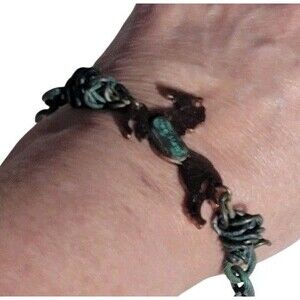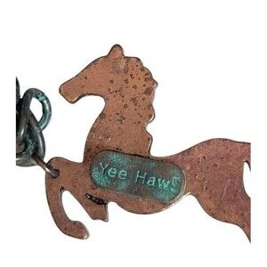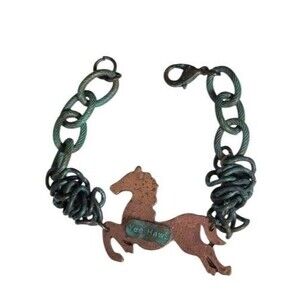 Fun Rustic design in a Copper Tone Horse with the words Yee Haw. The cable chain has a Green Patina Cable. This Bracelet is a unique and stylish accessory that features a horse-shaped charm with a green patina finish. The bracelet is made of metal and has a lobster closure for easy wear. With a length of 7" and some stretch, it is a versatile piece that can be worn by both men and women who appreciate equestrian and western-inspired jewelry. The multicolor design and horseshoe nail charm add a touch of personality to this original and non-customized bracelet.