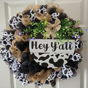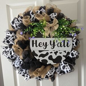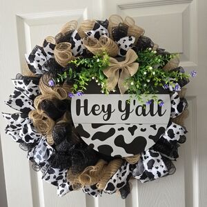 Welcome guests with this charming rustic wreath featuring a cow print design. Accented with burlap and vibrant greenery, it's perfect for adding a touch of country charm to your home.