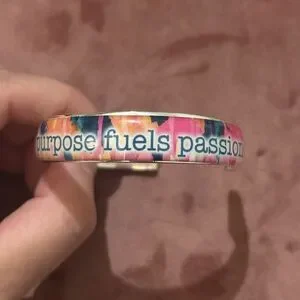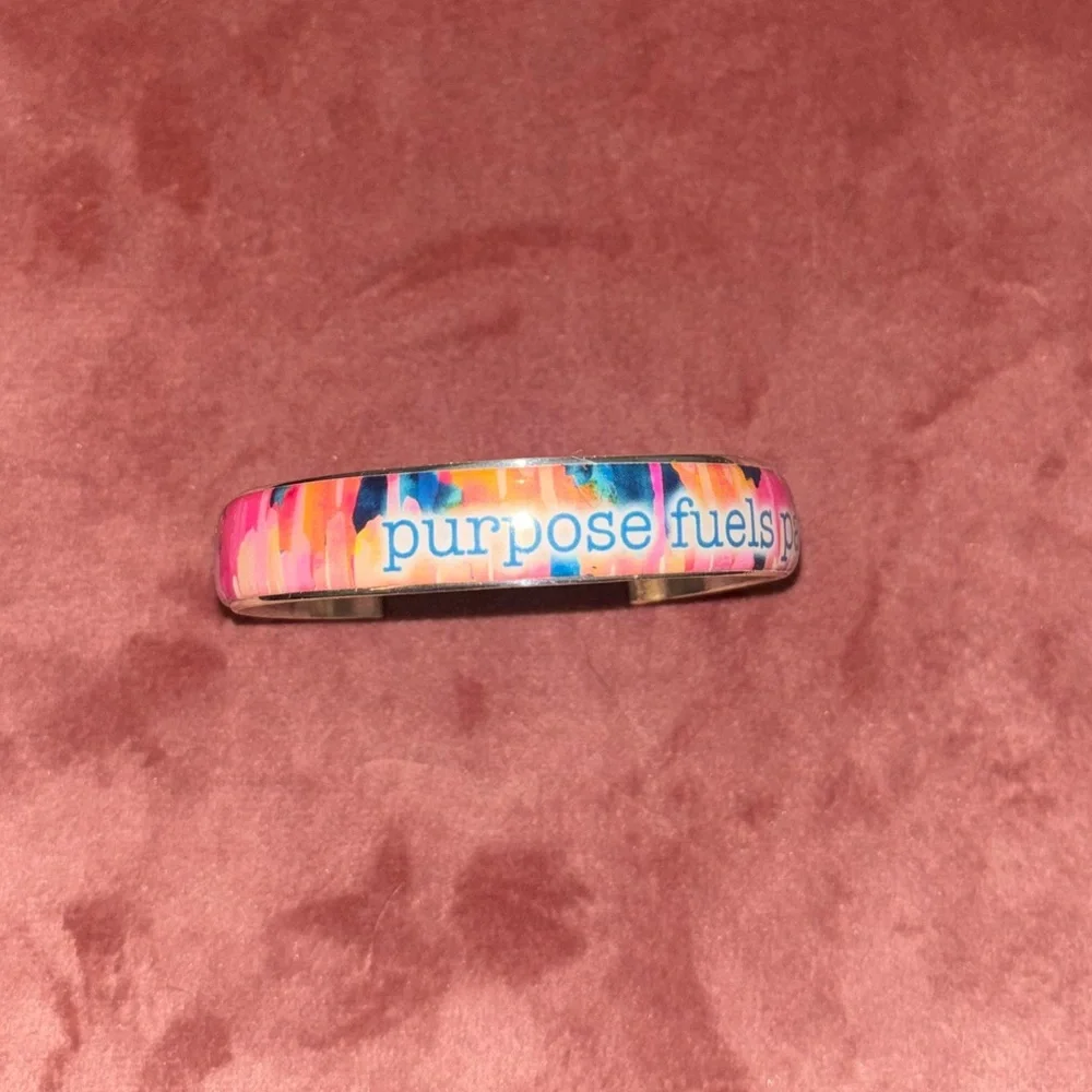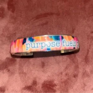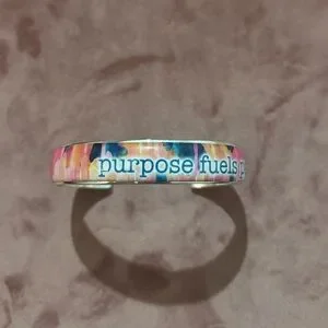 Rustic cuff that says “purpose fuels passion” on a beautiful watercolor background and silver cuff. Offers welcome!