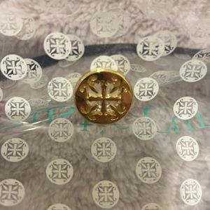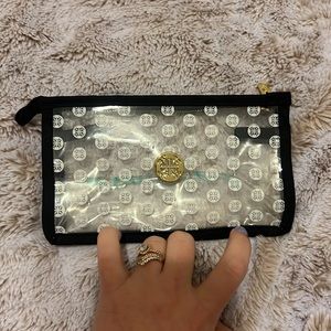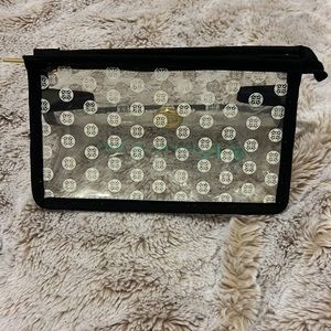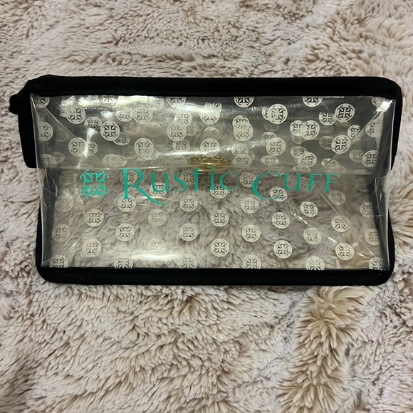 Clear and black rustic cuff accessory bag. Rustic cuff written in teal has gold hardware with fully functioning zipper.