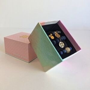 The Emerson Shamballa bead bracelet is a rhinestone-encrusted disco-ball design, and is complimented by two painted wood bead bracelets. One in black and gold tone, the other in dark blue and gold tone, they add an earthy sense of warmth to the coolness of the sparkling rhinestones. Whether stacked together or worn separately, this set will definitely bring a unique vibe to your wrist.