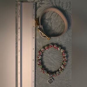 Stylish gold and silver bracelet paired with a colorful beaded bracelet. Features intricate designs and vibrant beads.