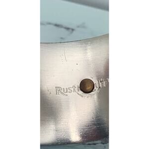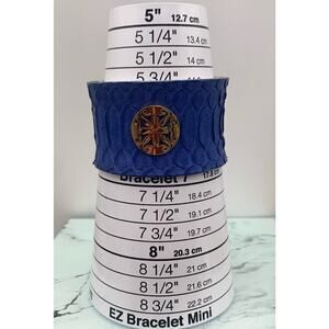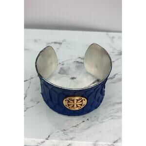Elevate your accessory game with this stunning Rustic Cuff bracelet. Crafted with a textured logo, this metal cuff comes in a beautiful cobalt blue color that will add a pop of color to any outfit. The cuff is signed by the brand, making it a unique addition to your collection.