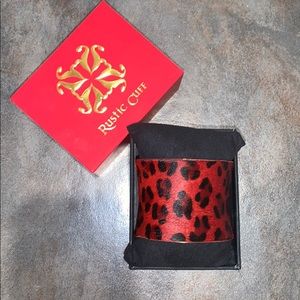 Red and black leopard print pony hair cuff with gold color metal bottom. This cuff is about 2 inches thick.