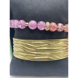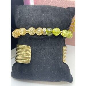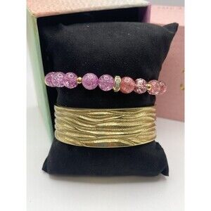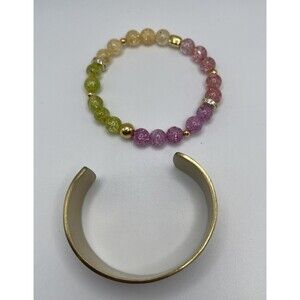 Two gorgeous bracelets by Rustic Cuff that has mermaid vibes. One textured gold tone cuff that looks like waves and a gorgeous multi colored pastel stretch bracelet with crackled glass beads. Comes in mermaid inspired grift box and brand new on pillow for great storage. Comes from a smoke free home.