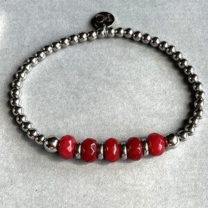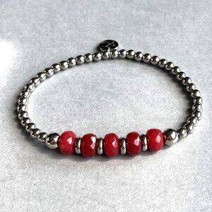 Rustic Cuff Red Faceted Carnelian and Stainless Steel Beads Stretch Bracelet