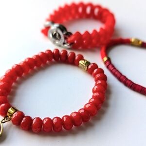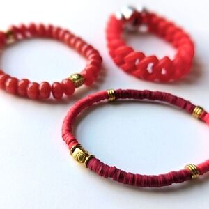 Rustic Cuff Set-3 Red Stacking Bracelets Silicone Links Polymer Clay Coral Beads
