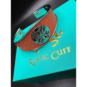 Rustic Cuff bracelet in orange snakeskin texture. Silver-tone metal accents.