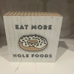 Add charm to your room with this rustic white and brown decor sign. Perfect for donut lovers it features a playful design that enhances any space. Measures 4” x 4” x 1.75”. Cross listed.