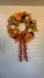 Beautiful pre-owned handmade fall wreath featuring mini pumpkins, pinecones, autumn leaves, berries, and a charming orange-and-black buffalo plaid bow with long ribbon tails. This wreath captures the warm, cozy feel of fall — perfect for decorating your front door, entryway, or wall during the harvest season, Halloween, or Thanksgiving.