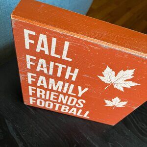 Crafted from natural wood, this sign features a welcoming orange hue with white text that reads: “FALL, FAITH, FAMILY, FRIENDS, FOOTBALL.” It’s perfect for enhancing your seasonal ambiance and can be displayed on a wall, as a freestanding shelf piece, or as a stylish addition to your desk. This sign is also a great way to add a touch of rustic charm to your Thanksgiving table or entryway.
