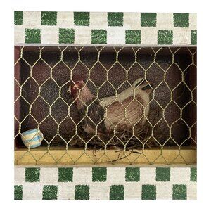 Bring a touch of country charm into your home with this **rustic farmhouse shadow box**. The piece features a three-dimensional hen in a coop, complete with nesting straw, a small feed bucket, and a protective layer of chicken wire over the front. The scene is framed with a **green-and-white checkered wooden border**, giving it a classic cottage-style look.