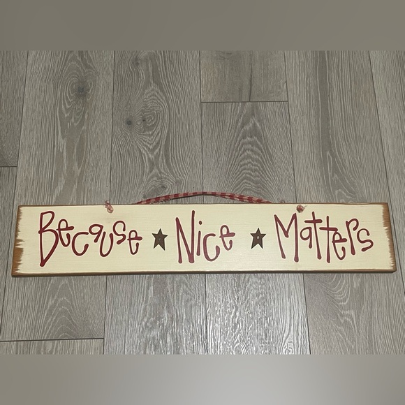 Rustic Wood Farmhouse Sign, “Because Nice Matters”. Red and Cream, with metal stars. 29 inches long, 5 1/2 inches high. Perfect for your Farmhouse Kitchen!!