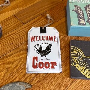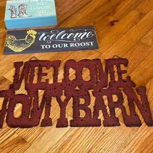 Set of rustic farmhouse welcome signs. Features rooster and barn-themed designs. Perfect for home decor.