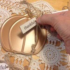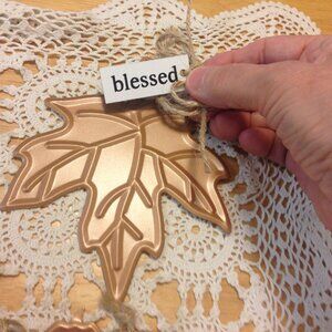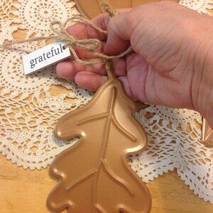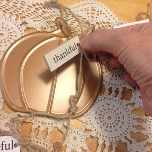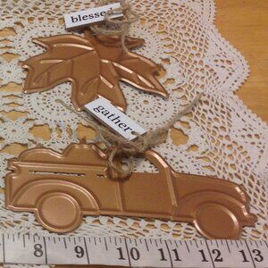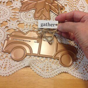 Four bronze-colored lightweight metal hanging pieces. Great for rustic farmhouse decor! Even has a farmhouse truck. Also appropriate for Thanksgiving decor or for a fall garden party.