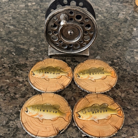 Add a touch of nature to your home with this rustic fish print coaster set. Perfect for fish enthusiasts, these coasters feature a detailed fish design on a natural wood background.