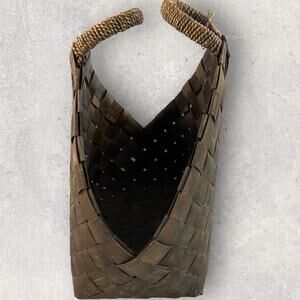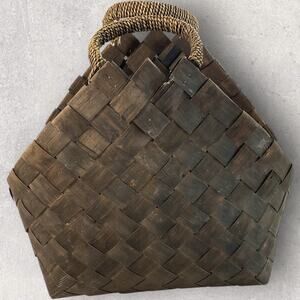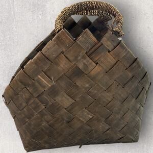 Rustic Flax Woven Basket Dark Wood Tote Farmhouse Decor Bag Purse w/ Handles