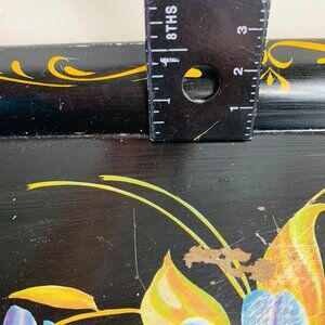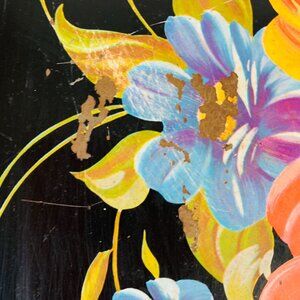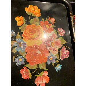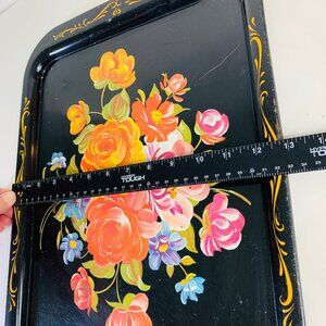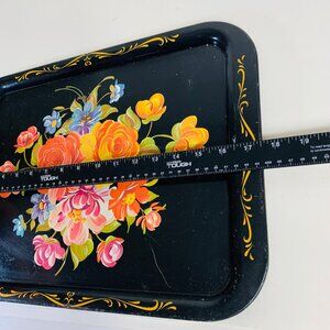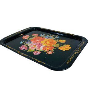 Step back in time with this charming vintage metal serving tray. The vibrant hand-painted florals set against a black background evoke a sense of nostalgia and timeless beauty. With its gold accent details, this tray is both functional and a piece of art worthy of display.